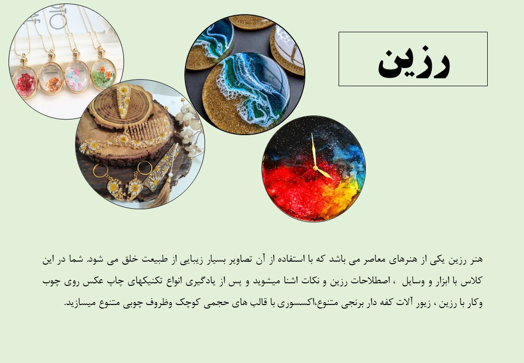 خروجی های احتمالی این پودمان :  آویز دیواری رزینی با عکس دلخواه ، قاب گوشی با رزین و گل طبیعی ، زیر لیوانی با طرح دلخواه ، سینی چوبی با ترانسفر و رزین ، گردنبند و گوشواره  و.....